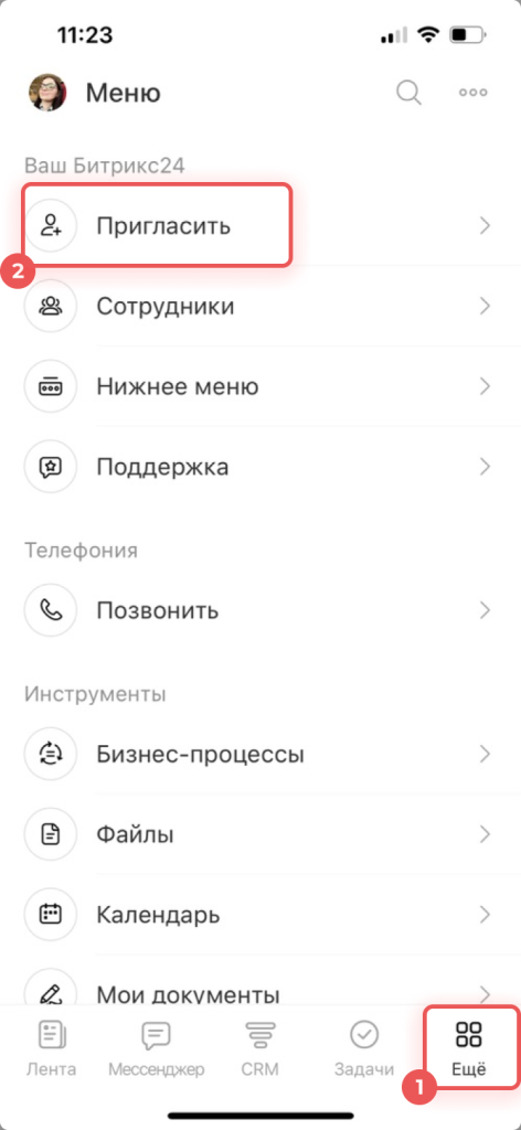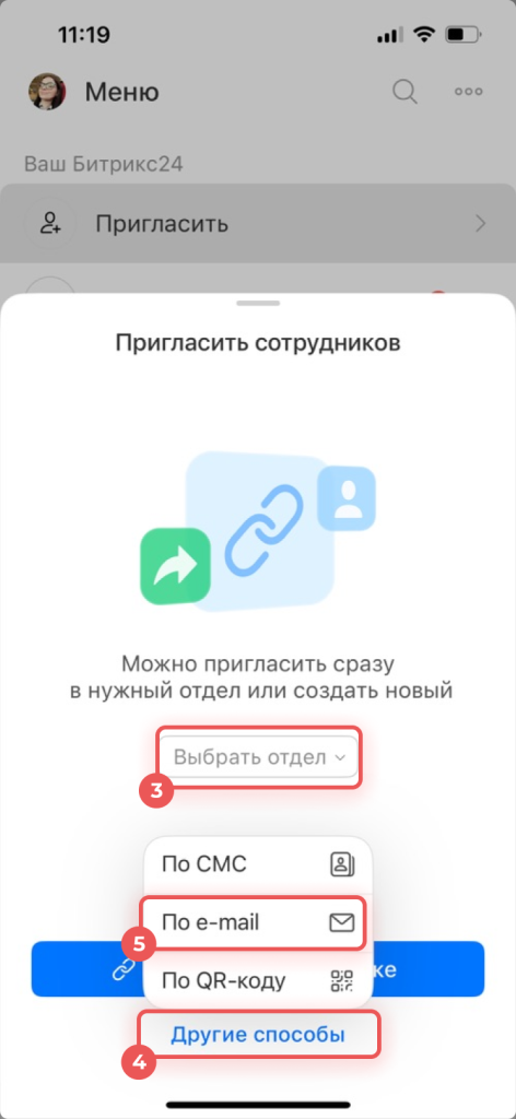 Чтобы подключить команду к работе в Битрикс24, можно отправить коллегам приглашения по электронной почте в мобильном приложении. Сделать это можно двумя способами: