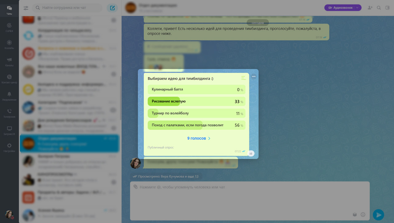 Опросы. Теперь в чатах можно создавать опросы. Это упрощает сбор мнений сотрудников по любым вопросам — от согласования дат и утверждения проектов до выбора поставщиков.