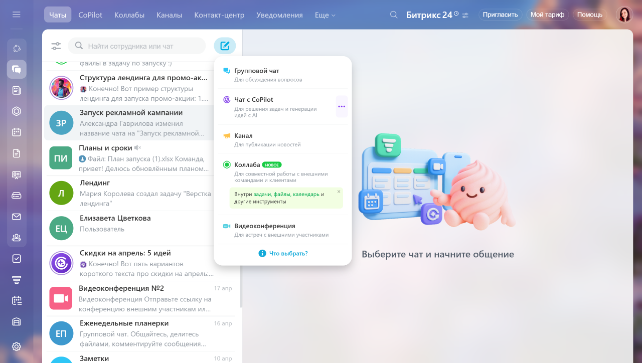 Теперь все инструменты для совместной работы собраны в одном окне. Чаты, каналы, видеозвонки, CoPilot, задачи, CRM доступны без переключений.