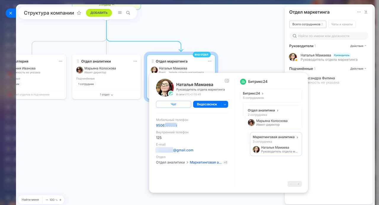 Мини-профиль сотрудника. В мини-профиле сотрудника указаны его телефон, внутренний номер, почта, отдел и руководитель. Вы увидите, кто чем занимается и сможете быстро связаться с коллегами.