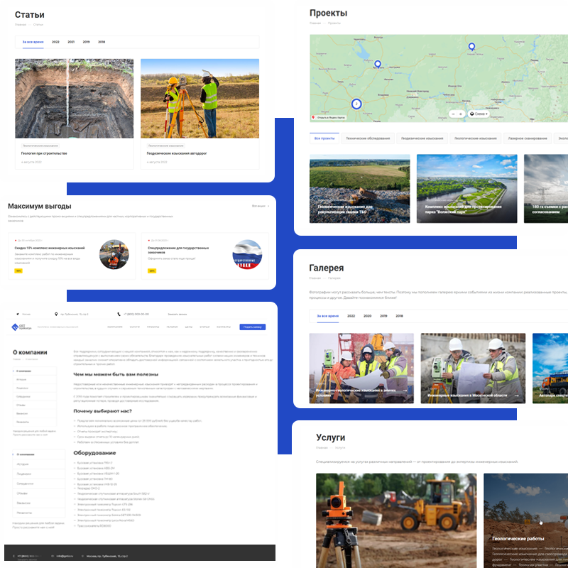Сайт обладает красивым дизайном, необходимым функционалом для представления и продвижения Вашей компании по инженерным изысканиям в Интернете
