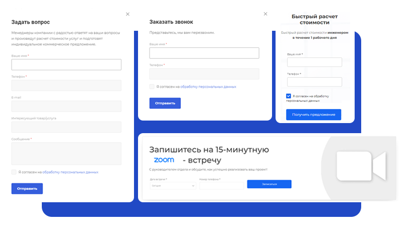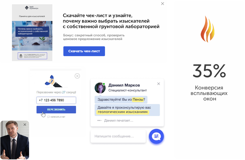 Используйте видеообращение на сайте, форму обратного звонка, умный чат, чек-листы, управляйте вниманием клиентов и собирайте контакты с помощью всплывающих окон.